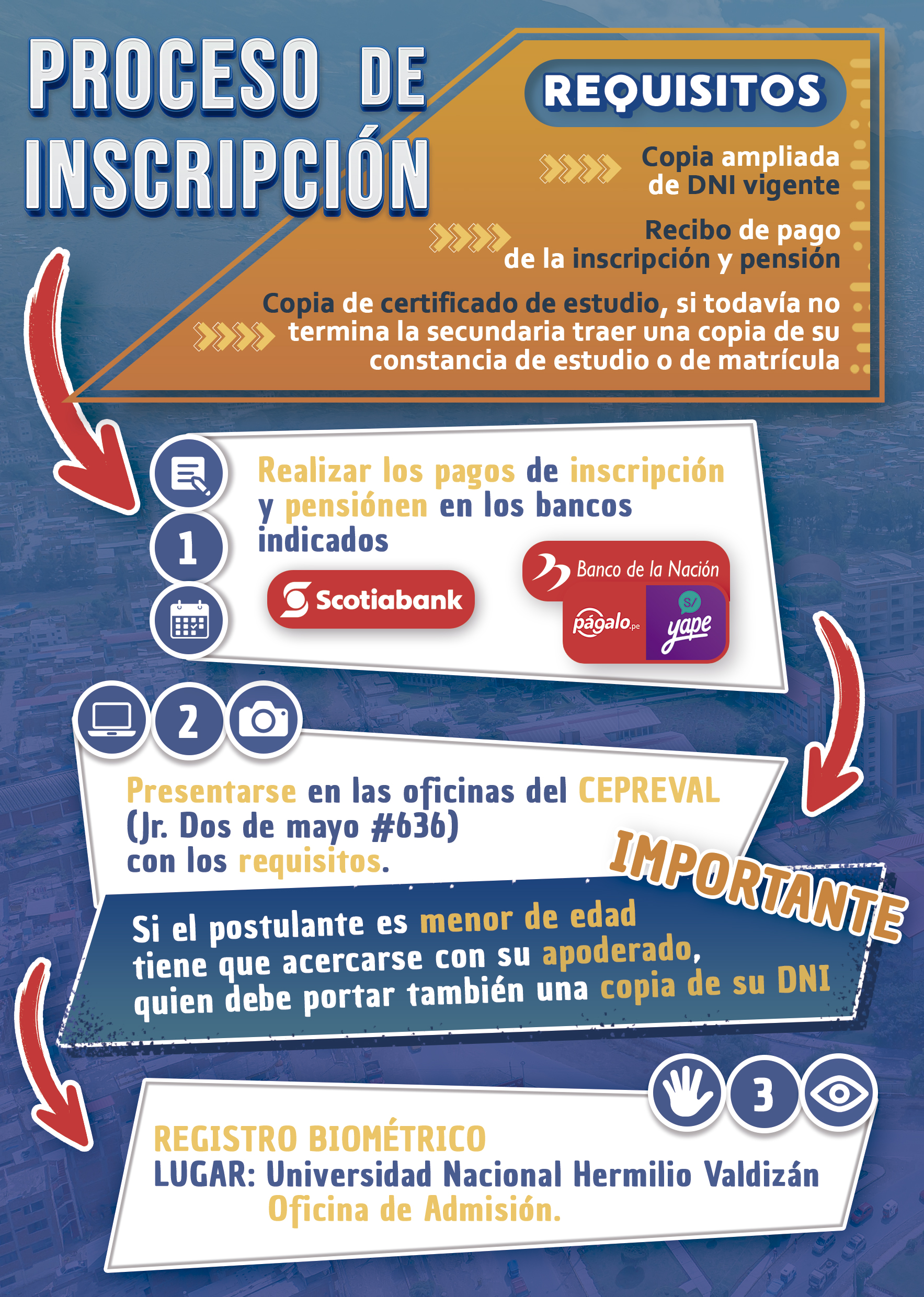 Para el proceso de inscripción, el postulante tiene que acercarse a la oficina central llevando sus requisitos y luego registro de fotografía y huella.